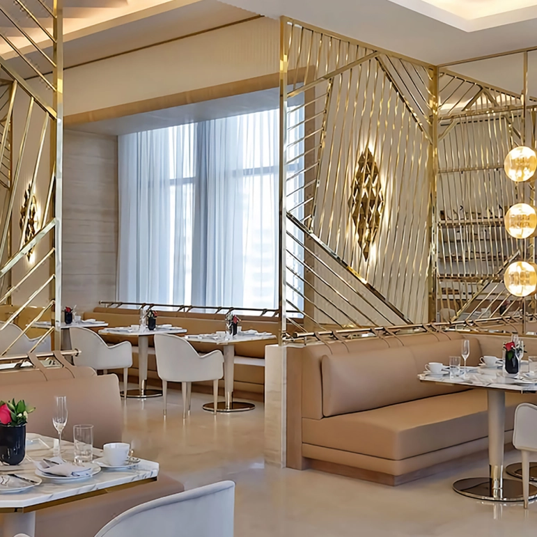 أقسامنا تتميز بأنماط متنوعة لتناسب كل موضوع فندق. تتميز التصميمات الحديثة بإطارات معدنية أنيقة مع أنماط هندسية ، وهي مثالية للوبيات المعاصرة. تتضمن الخيارات الفاخرة عناصر معدنية مذهب أو زجاج محكم ، مما يضيف الفخامة إلى مناطق تناول الطعام الراقية. من أجل أجواء دافئة ، تلبي الأقسام الخشبية ذات المنحوتات المعقدة أو التشطيبات الطبيعية الإعدادات الريفية أو التقليدية. مصنوع من مواد متميزة - المعادن المعدنية والزجاج الفني وخشب متين - يضمنون طول العمر والمرونة في بيئات الفنادق الصاخبة.