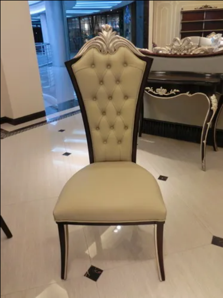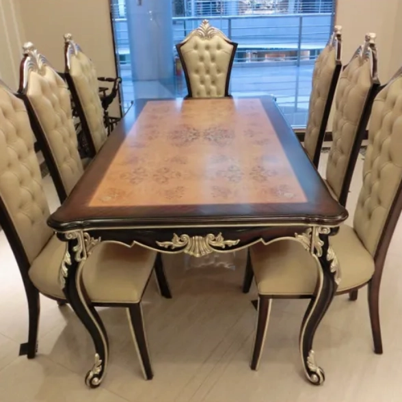 الكراسي هي تحفة من التفاصيل-تسمية مسندات الظهر العالية تتميز بمنحوتات معقدة ولهجات معدنية لامعة ، في حين أن تنجيد الأزرار البيج يضمن الراحة. الساقين الخشبية الداكنة ، على شكل منحنيات أنيقة وحقوق معدنية خفية ، تعزز جمالية الملكية. تصبح طاولة الطعام ، التي تتميز بنهاية خشبية غنية وأنماط زهرية مزخرفة على سطحها ، محورًا. تجسد المنحوتات الرائعة على طول الحواف والساقين الأناقة الكلاسيكية.